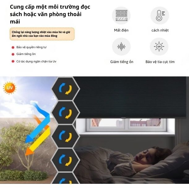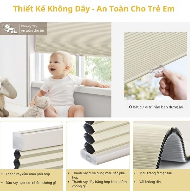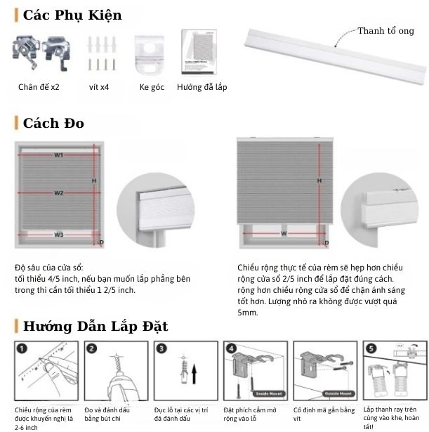 | Cơ Cấu Hoạt Động | Rèm tổ ong dạng gập nhẹ, dễ lắp đặt |